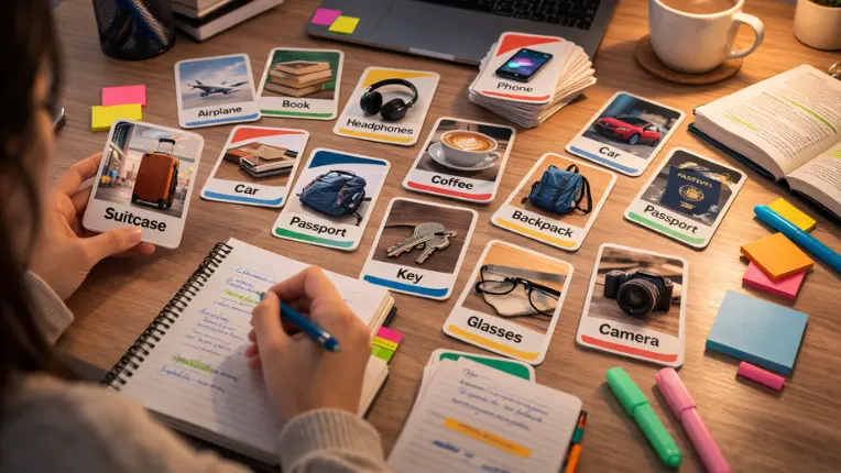 - 💡 Prompt inglés: “Generate 20 beginner-level travel vocabulary flashcards in English with example sentences”